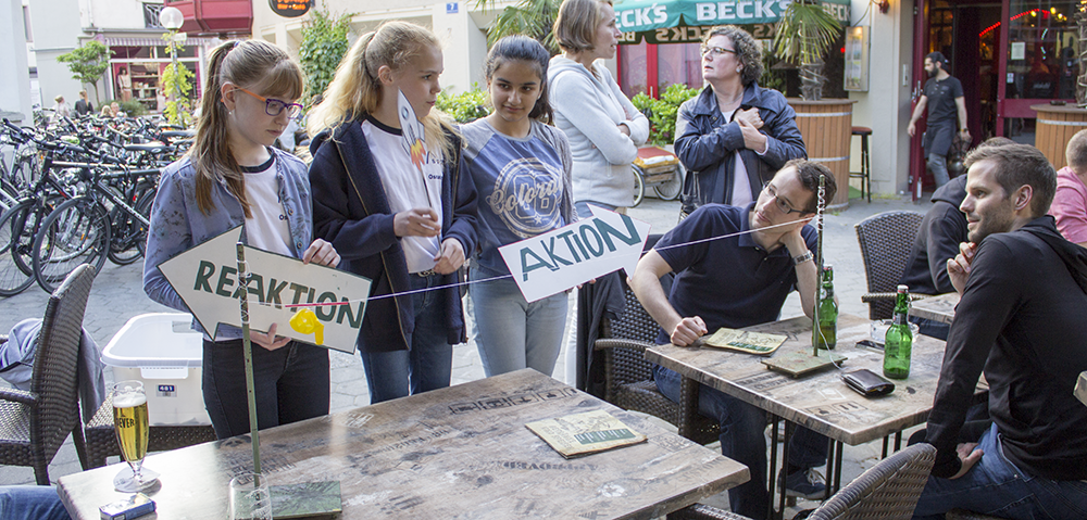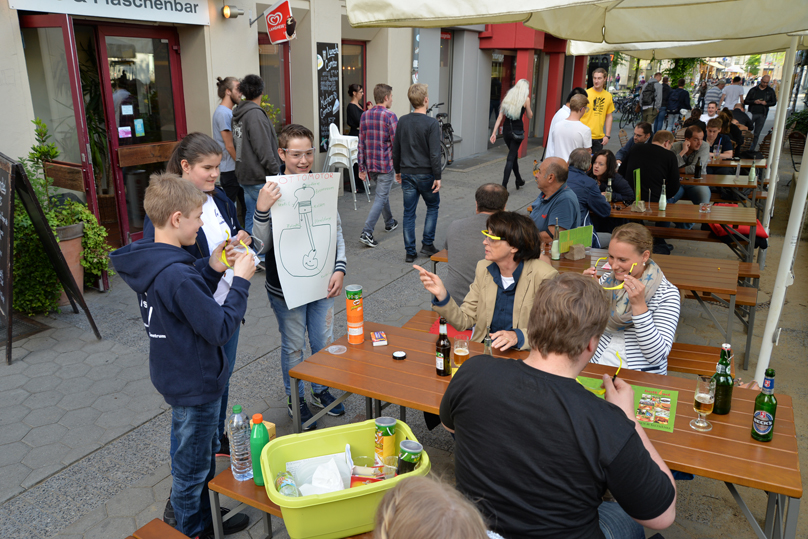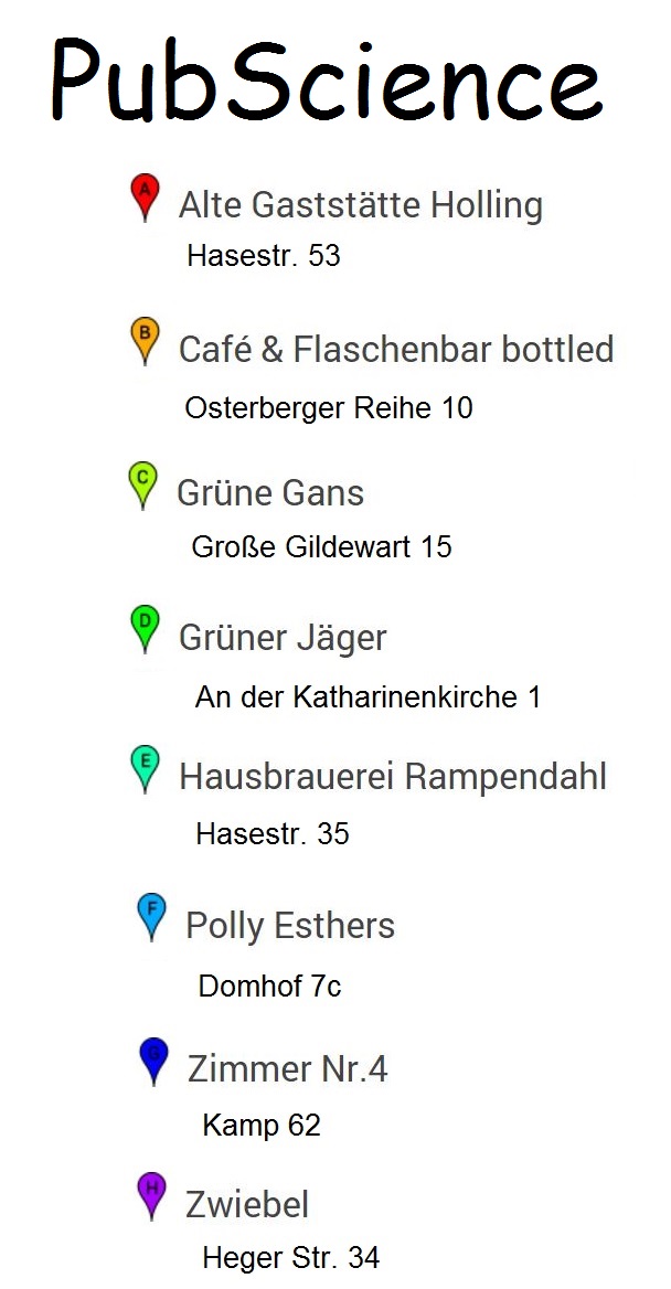 Bei der Aktion PubScience hatten die Schülerinnen und Schüler der Oberstufe die Aufgabe, selbstständig spannende und verblüffende naturwissenschaftliche (Alltags-)-Phänomene, wie z.B. die Funktionsweise von Babywindeln, das Prinzip eines Mikrowellenofens oder die Vorgänge beim Abbrennen einer Kerze, aufzubereiten. In der Vorbereitungsphase haben sich die Schülerinnen und Schüler in Kleingruppen zunächst fachlich intensiv in die jeweiligen Themenstellungen eingearbeitet und passende Experimente durchgeführt und optimiert, die sich für eine Präsentation in gastronomischen Einrichtungen eigneten. Im Anschluss daran wurden entsprechende allgemeinverständliche Erklärungen entwickelt, gemeinsam diskutiert und ggf. weiter optimiert. Nach Abschluss dieser vorbereitenden Phase fand im Sommer 2016 an einem Abend in der Osnabrücker Innenstadt in insgesamt 7 Kneipen, Restaurants und Pubs die Veranstaltung „PubScience“ statt. In einem Rotationsverfahren besuchten mehr als 50 Schülerinnen und Schüler die verschiedenen Lokale und führten mit den Besucherinnen und Besucher die vorbereiteten Experimente durch und diskutierten mit ihnen die dahinterstehenden theoretischen Konzepte. Dabei werden mit diesen Projekten u.a. die folgenden zentralen Zielsetzungen verfolgt: